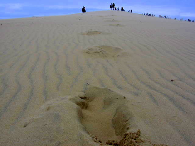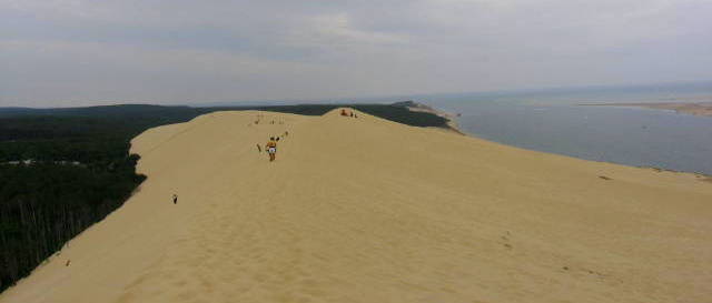 Žmonės lipa į Pilat kopą. Ši vieta buvo įtraukta į gamtos paveldo sąrašą nuo 1994 m. ir yra aukščiausia kopa Europoje. Pilos kopa stebina ne tik savo įspūdingu dydžiu, bet ir kvapą gniaužiančia panorama, atsiveriančia nuo jos viršūnės: Arkašono įlanka, Argiuno smėlio sekluma, Kap Fero švyturys ir miškai, besitęsiantys iki pat horizonto.