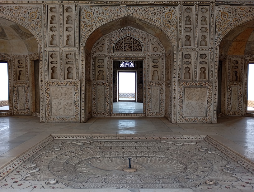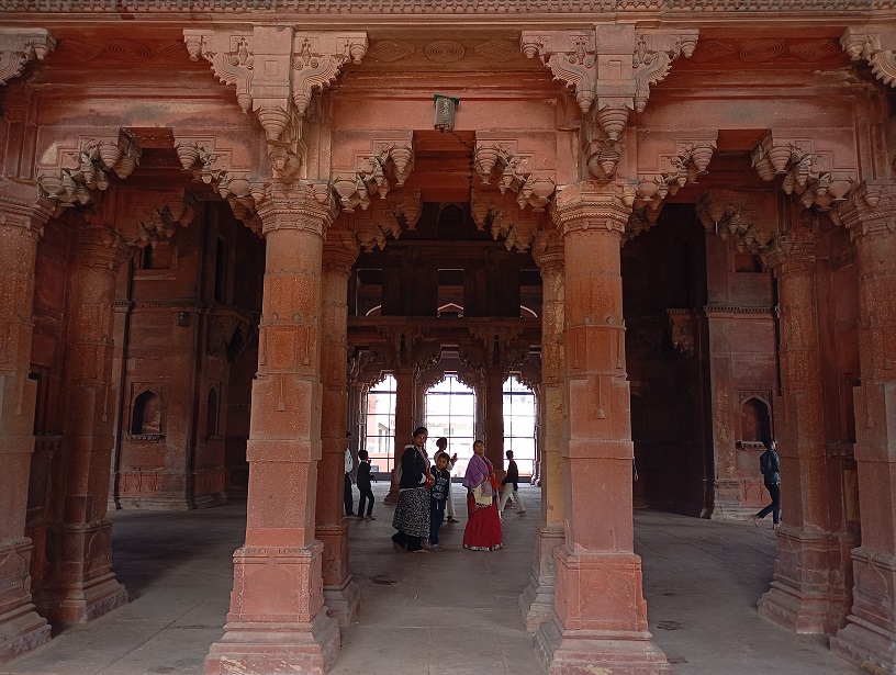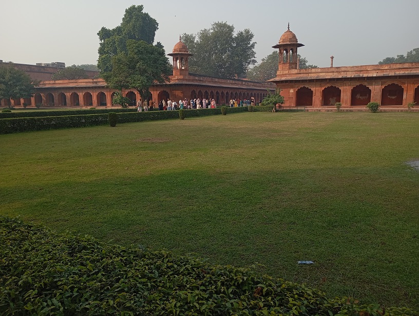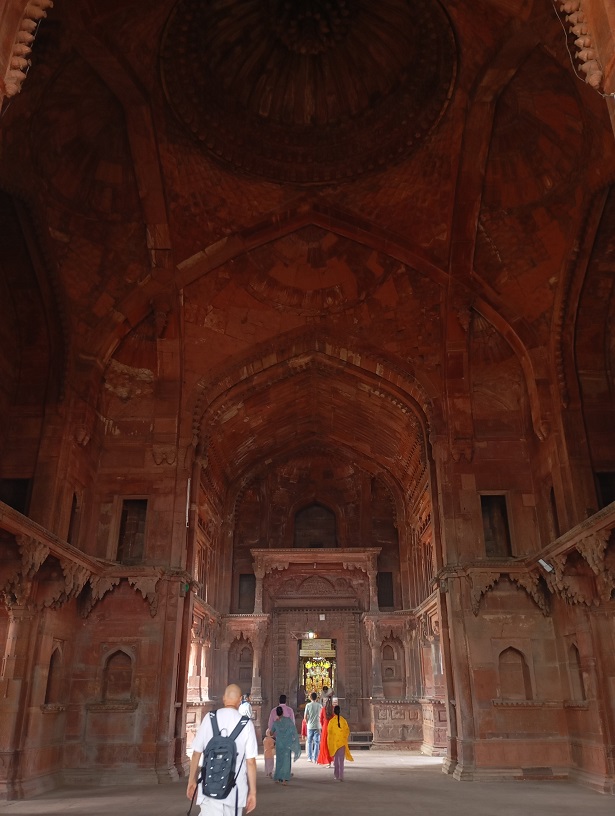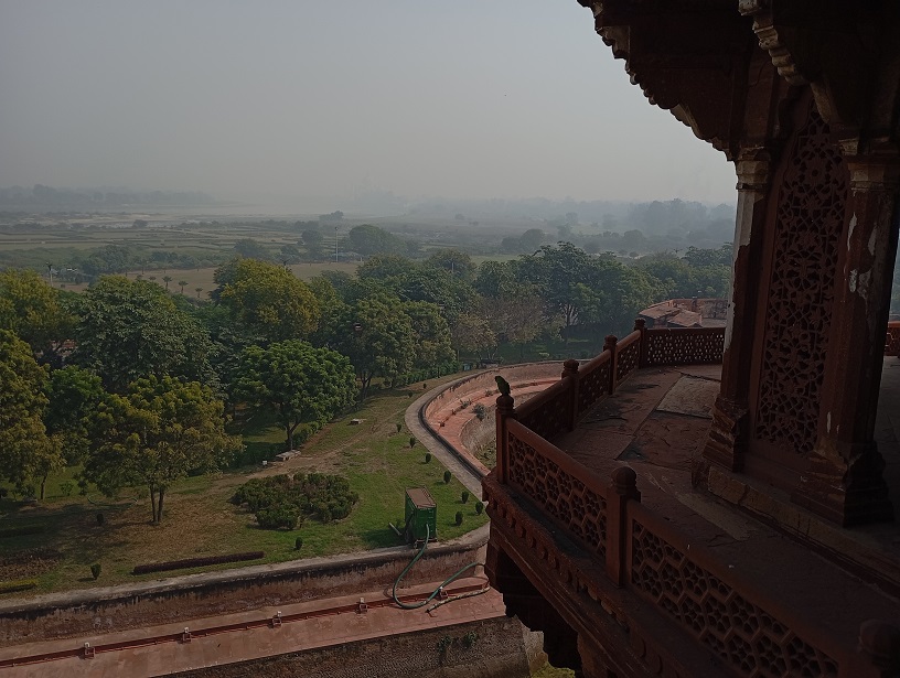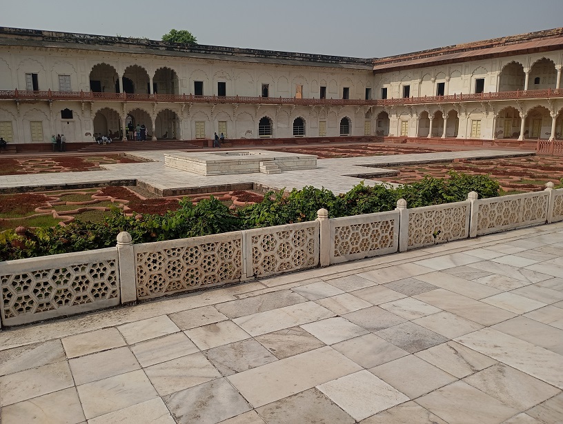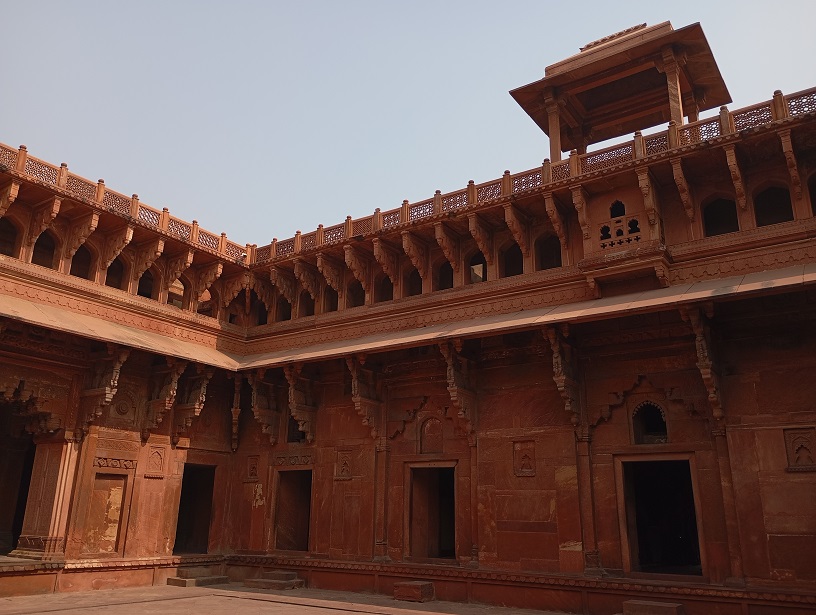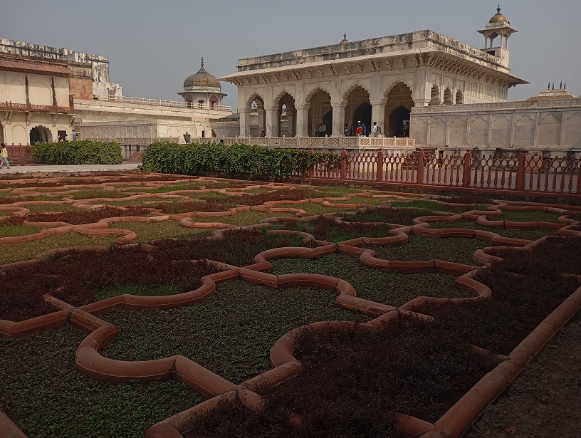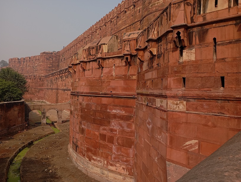 Agros fortas. Tai didžiulis raudono smiltainio fortas, pastatytas XVI a. Mogolų imperijos valdovo Akbaro laikais (1565–1573 m.). Jis buvo karinė bazė, bet tuo pat metu – imperatoriaus rezidencija ir administracijos centras. Fortas nėra tik viena pilis – tai visas maždaug 380 metrų ilgio ir 240 metrų pločio kompleksas su: rūmais, mečetėmis, sodais, tvirtovės sienomis, bastionais ir vartais. Fortas buvo statytas hindu ir islamo stiliaus deriniu, ypač Akbaro laikais. Vėliau mogolų imperatoriai, įskaitant Šachą Džahaną, pridėjo įspūdingų marmuro rūmų ir dekoracijų.